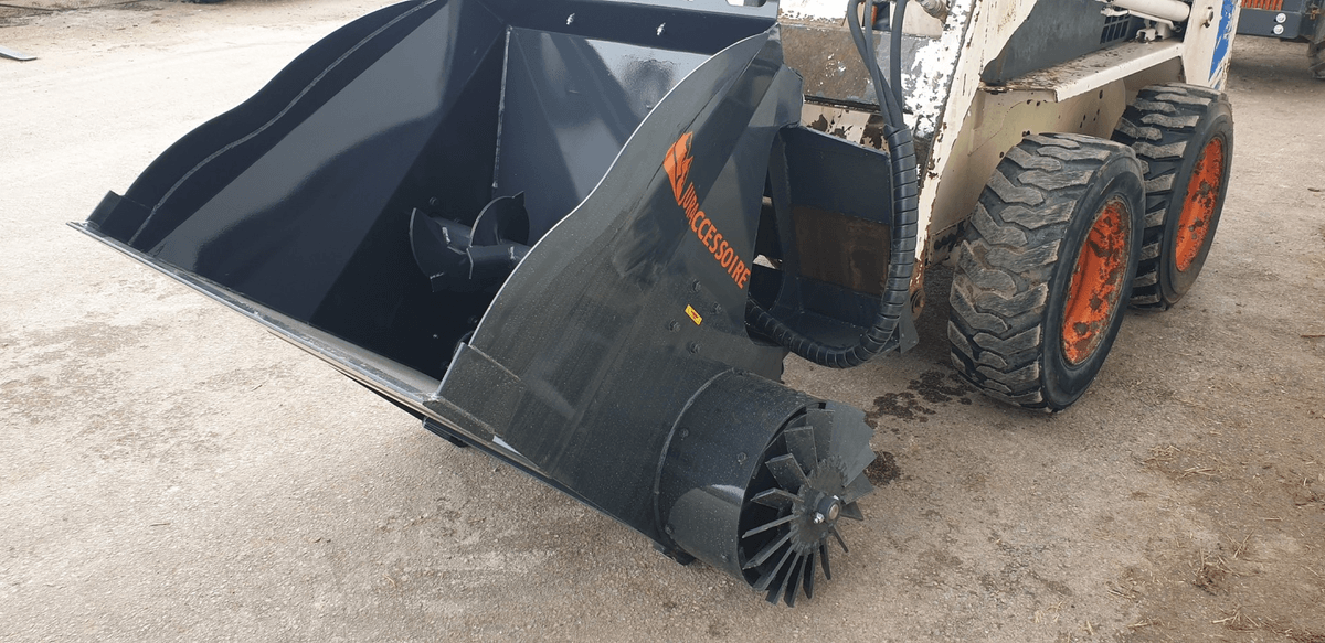 - 1 - Godet distributeur d’aliments à 1 vis pour répartir des aliments type ensilage de maïs ou d’herbe en brins ou aliments courts. Distribution sur le côté par vis en fond. Sortie à gauche avec possibilité de 2 sorties en option. Sortie à droite possible. Un désilage par griffe ou couteau ainsi qu’un coupe betteraves ou pommes de terre et aussi faisable en option. La capacité du godet va 985 L à 2 500 L.