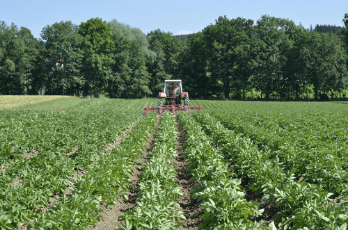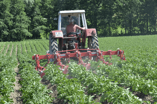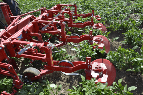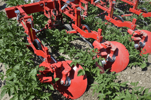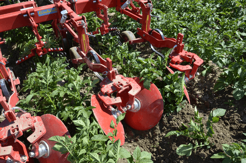 La bineuse HILLSTAR est un outil de buttage dont les dents à l'avant émiettent le sol et les grands disques butteur, montés en biais, remodèlent les buttes. Le grand diamètre de ces disques ménage la culture en place.