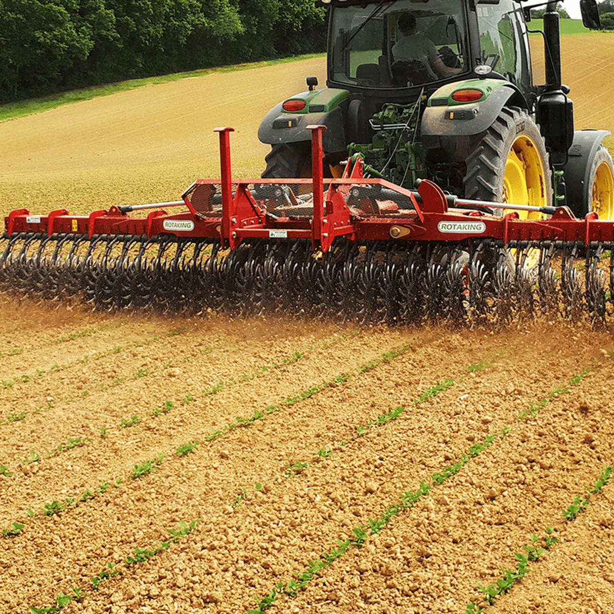 La houe rotative ROTAKING pour le désherbage mécanique, l’écroutage, l’aération du sol des cultures, fixe ou repliable avec une largeur de travail de 3 m à 12,4 m selon les modèles. Rotors Ø 540 mm décalés montés en quinconce sur 2 rangées décalées, espacement de 87 mm permet de mieux laisser passer les résidus végétaux et évite le blocage par les pierres. Réglage de la position des roues (1,5 m-2,3 m) pour s’adapter aux entre-rangs et pour la hauteur des roues grâce à une crémaillère et un indicateur. Attelage 3 points en chapes Cat.2 et 3. Nombreux équipements de série et en option pour chaque utilisation.