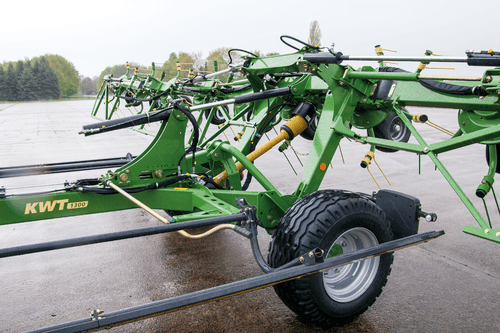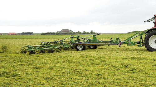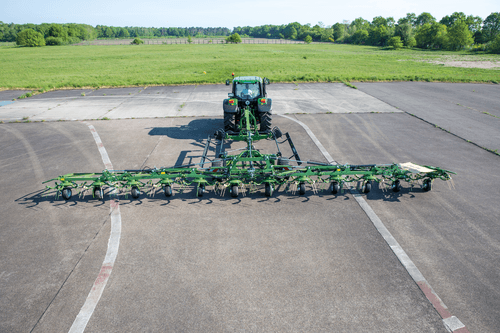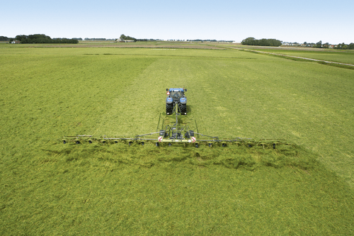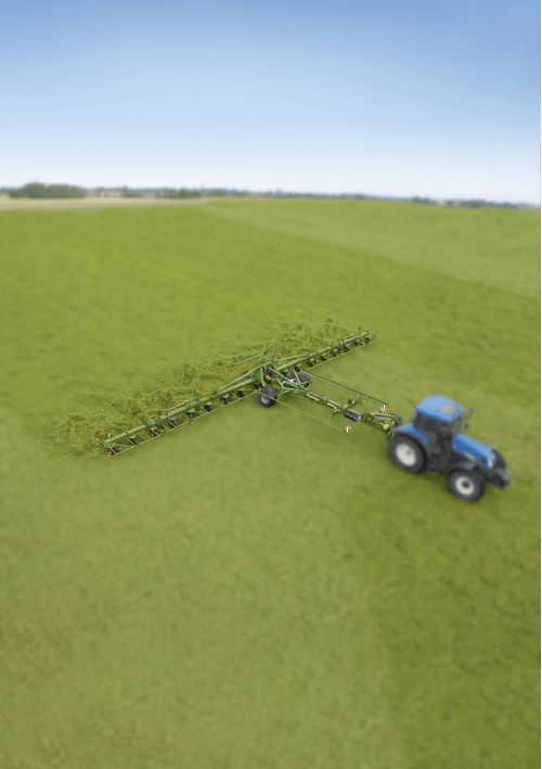 Les faneuses KWT grandes largeurs travaillent de 13,10 m à 19,60 m avec de 12 à 18 toupies.