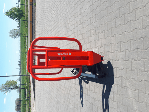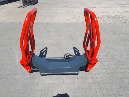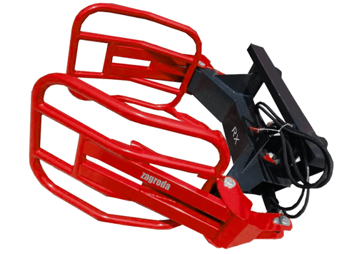 Pince balle ronde. Gamme RX. Attelage EURO. 1 vérin double effet, 2 bras mobiles. Diamètre de balles 0,90 à 1,60 m. Capacité 800 kg. Ouverture max des bras : 1,9 m. Poids : 155 kg.