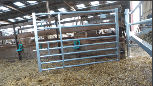 Barrière construite en tube de 40 mm de diamètre. Etant réglable, cette barrière est très pratique en intérieur de bâtiment pour veaux, moutons et chèvres.