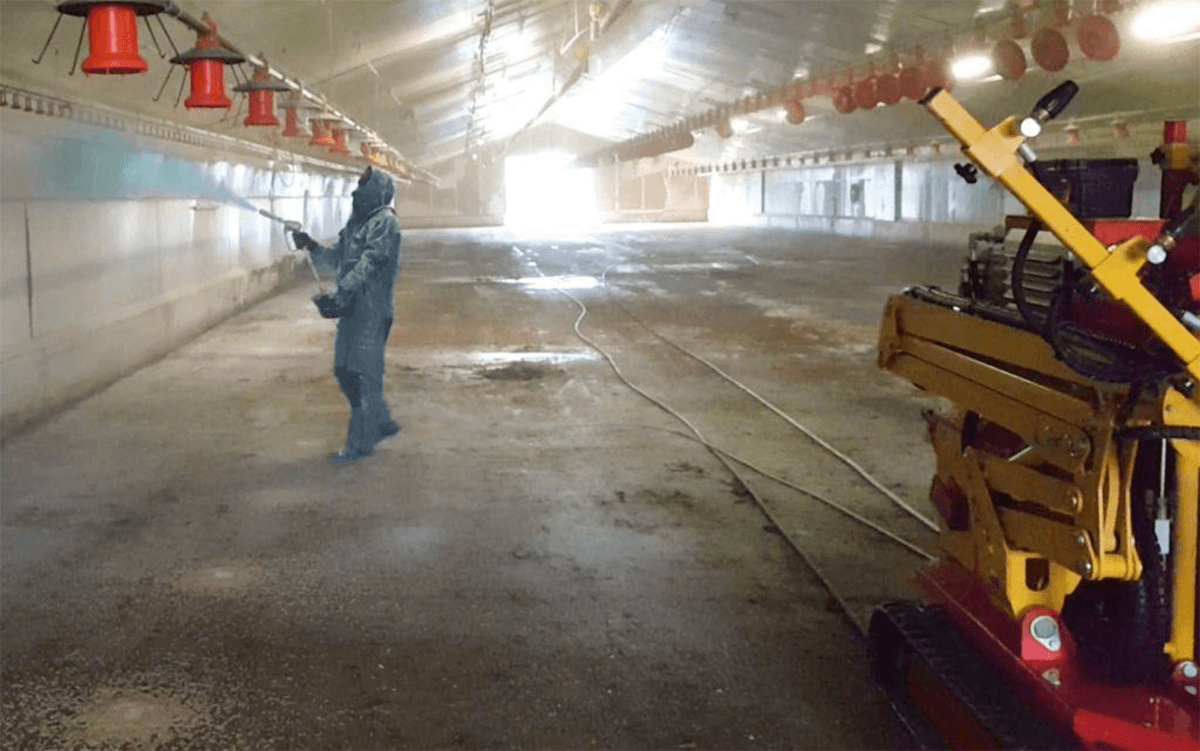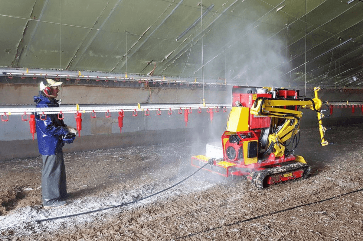 La laveuse de bâtiments avicoles LAVICOLE est montée sur un chenillard totalement radiocommandé qui permet le travail sur béton comme sur fumier. Quatre dispositifs de lavage permettent un lavage de qualité et complet du bâtiment :