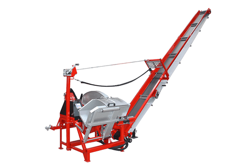 Scie circulaire à chevalet avec tapis monte bois. PDF tracteur 380 tr/min, tapis longueur 5 m, hauteur...