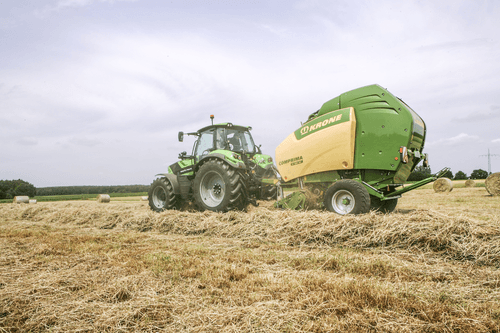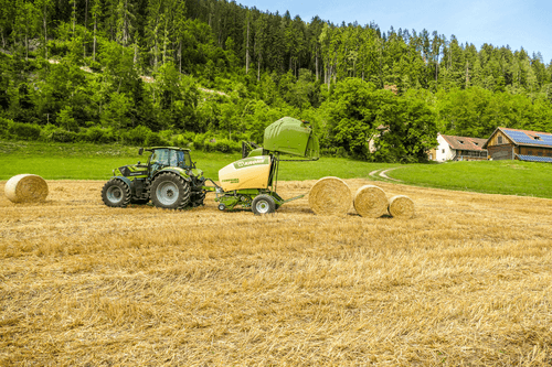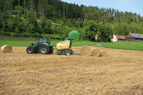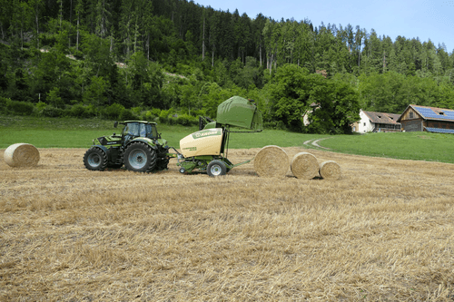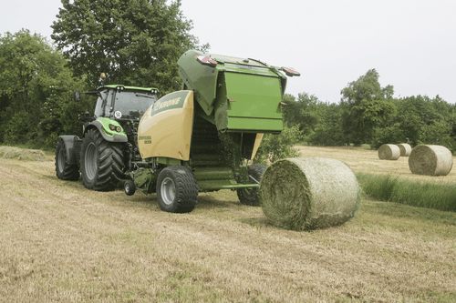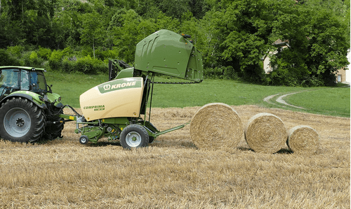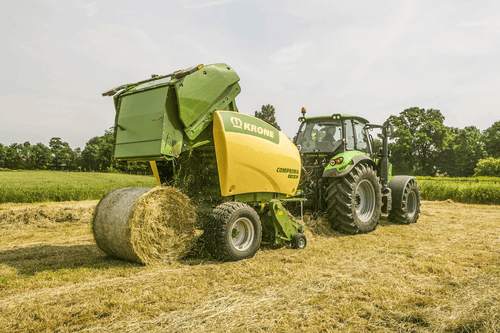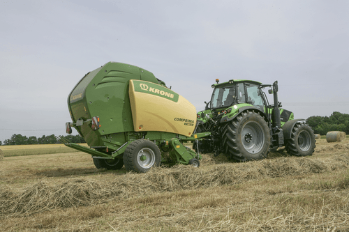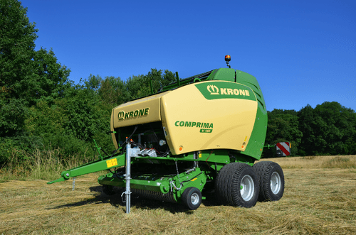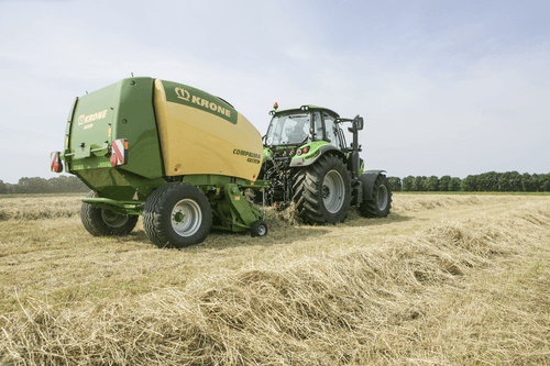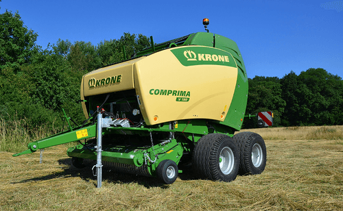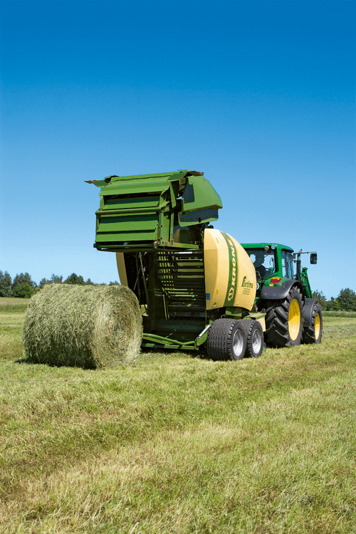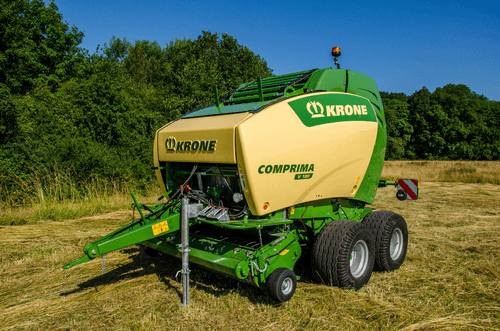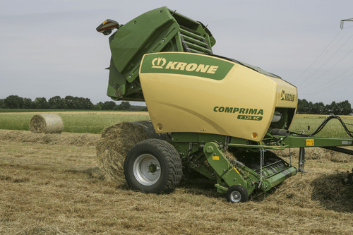 La presse Comprima V possède une chambre variable jusque 2,05 m de diamètre composée de deux tapis de pressage à sangles et barrettes. La sangle NOVOGRIP par KRONE est endurante et permet une formation de balle parfaite grâce à l'effet d'engrenage du fourrage.