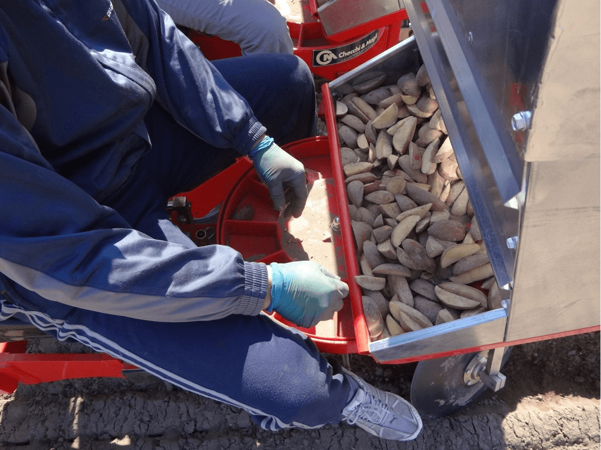 Une planteuse de pommes de terre et autres tubercules à roues motrices qui existe en 1, 2, 3 ou 4 rangs. Attelage 3 points pour tracteurs ou mini tracteur. Avec un système de distribution horizontal à alvéoles. La distance d’ensemencement va de 14 à 28 cm. La trémie a une capacité de 80 kg. Roues d’appui et disques de couverture réglables en profondeur, largeur et inclinaison au choix, version à socs pour terrains très légers (sableux). Choix d’accessoires en option pour chaque utilisation