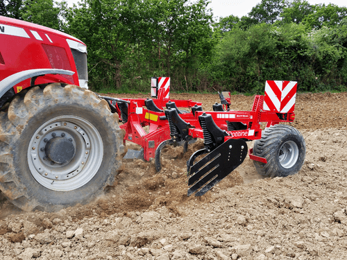 Gamme de déchaumeurs poussés OPTILINE avec châssis tripoutre carré de 100 x 100 et 3 rangées de dents soit sécurité non-stop ressort ou sécurité boulon de cisaillement ou de type queue de cochon carré 35 mm.