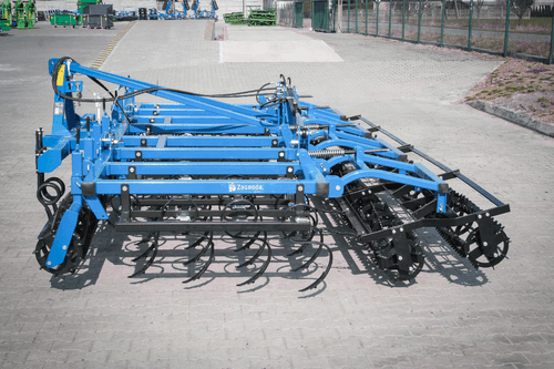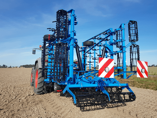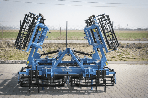 Attelage 3 points cat. II et III sur axes. 4 rangées de dents de cultivateur SU 32x12 renforcées avec soc standard. Double rouleau en fers plats dentés Ø 300mm.