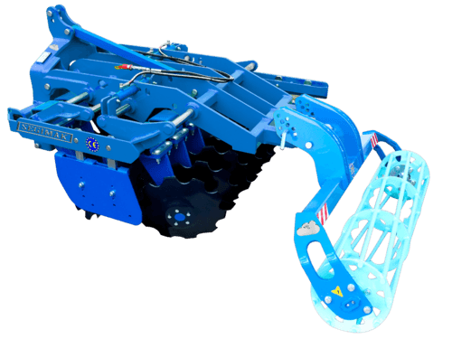 Châssis fixe de 1,55 m hors tout, disques de 510 mm, système de sécurité élastomère, châssis de 80x80, paliers sans entretien, travail 5 à 12 cm, rouleau cage 340 mm.