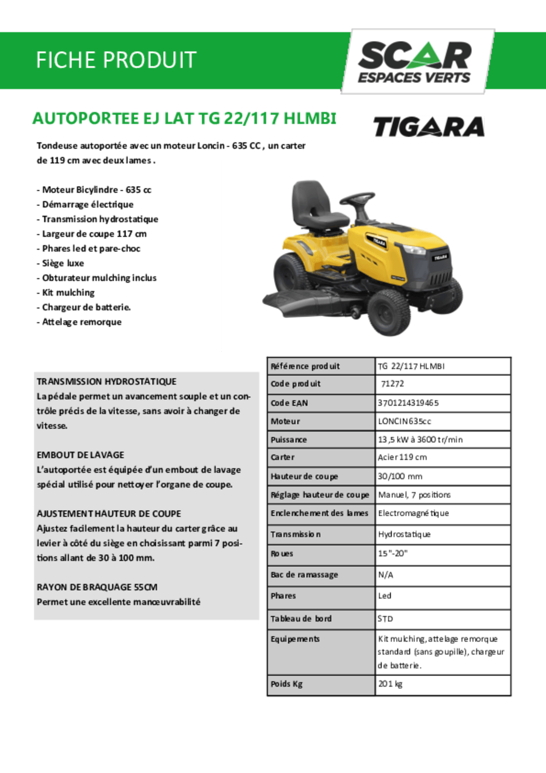 - Tondeuse autoportée à éjection latérale TG 22/117 HLMBi