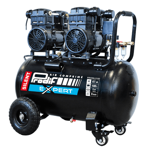 Sans huile. 6 L. Débit restitué : 61 L/min, 8 Bar. Moteur bicylindre S1, 0,75 CV. 220 V.
