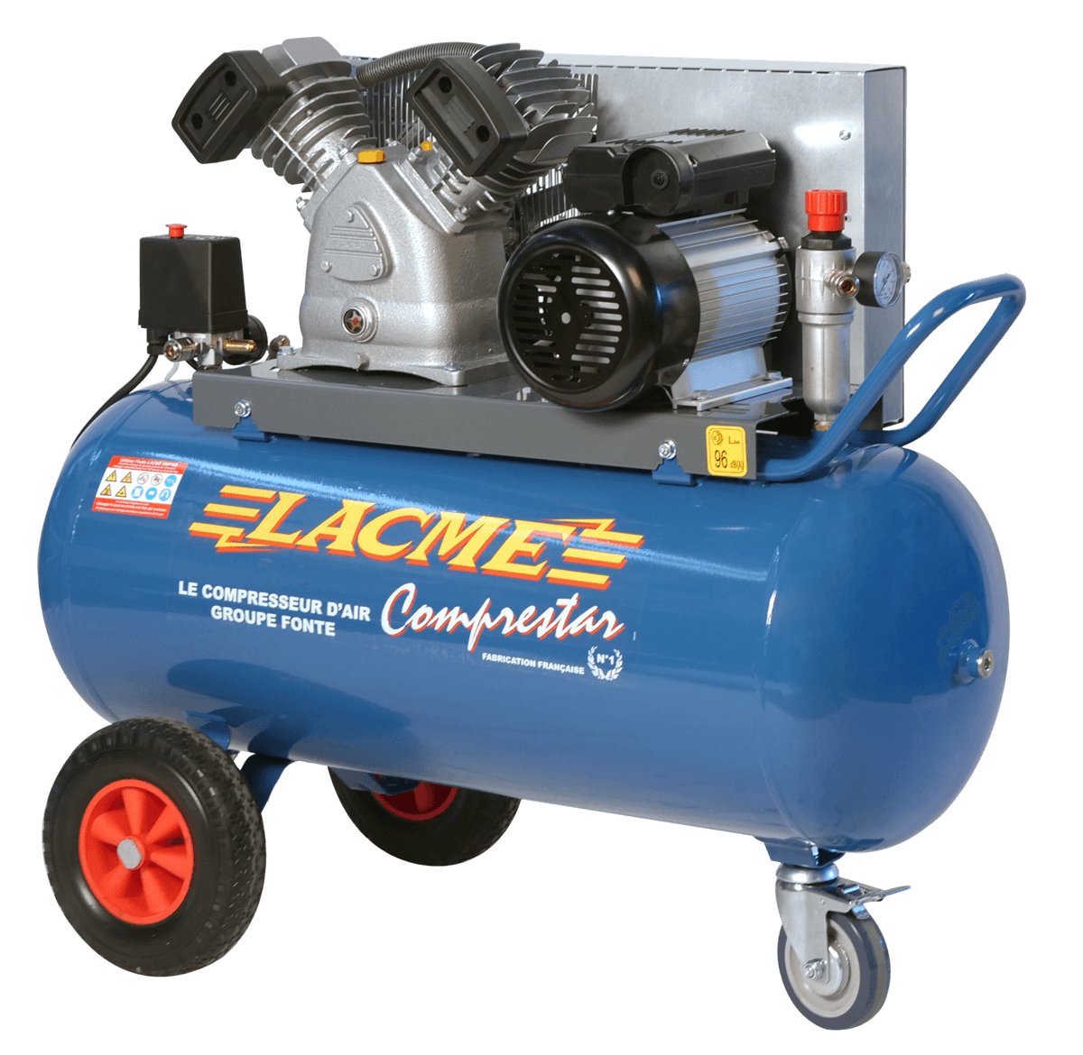 Compresseur mobile Comprestar 23V100M à courroie , 23 m3/h , groupe fonte bicylindre en V , moteur 4 CV , monophasé 230 V, cuve 100 litres 11 bars, 3 sorties raccords rapides : 1 directe et 2 filtrées/régulées sur épurateur détendeur GM.