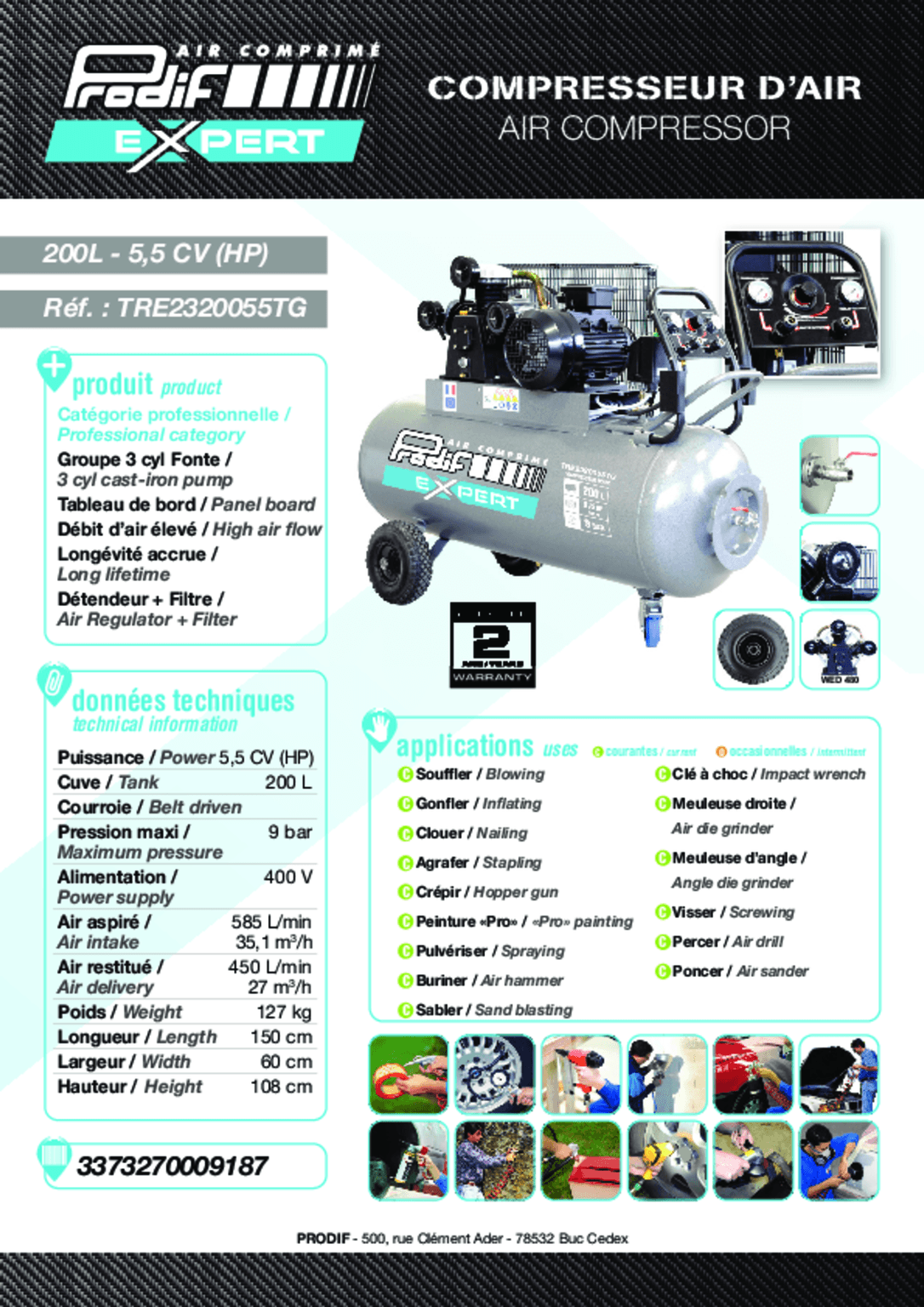 - Compresseur triphasé 200 L 9 bar