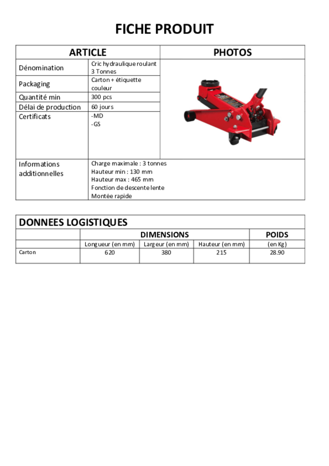 Cric hydraulique 3 tonnes