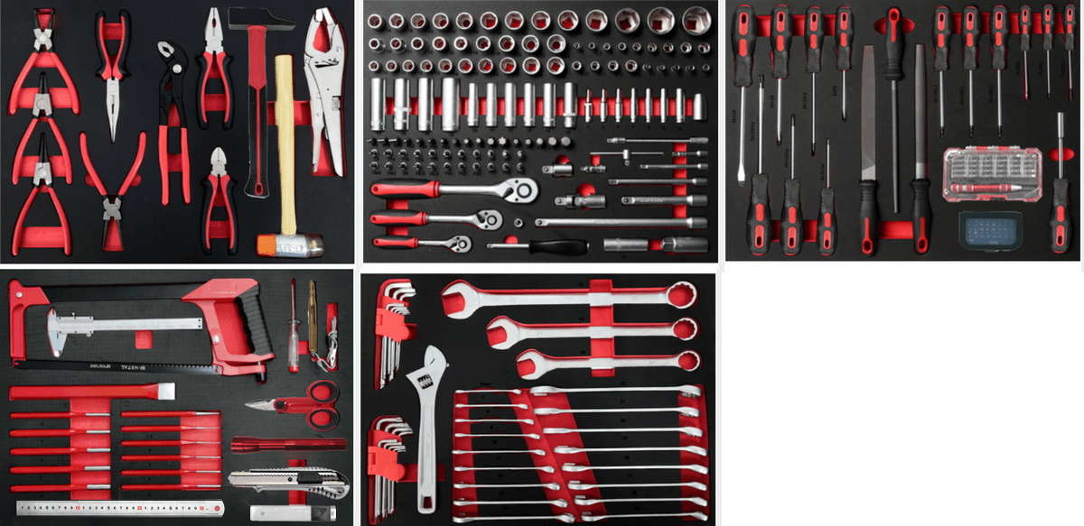 Clés : 20 mixtes, 1 à molette 10'', 9 torx, 10 allen.