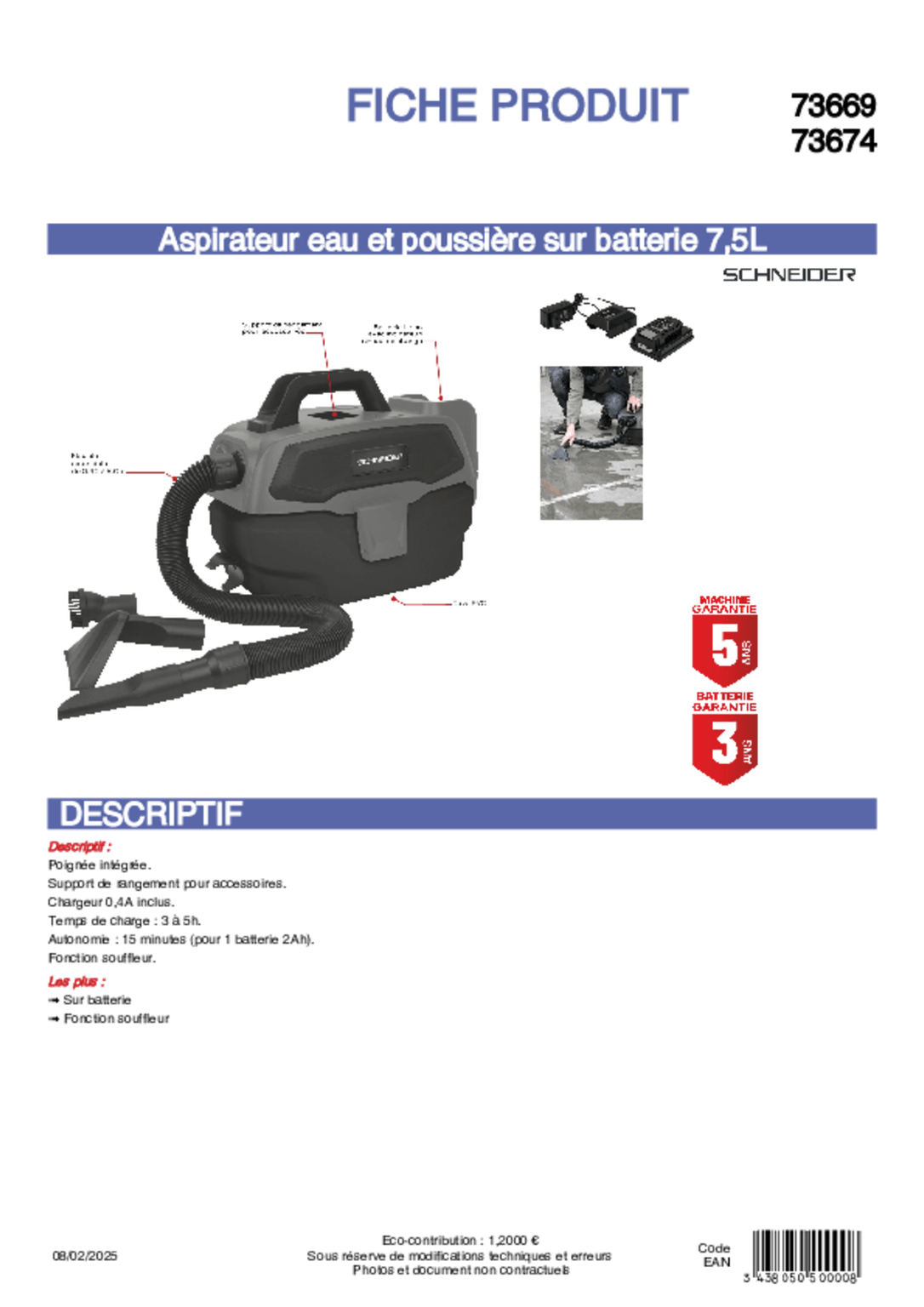 -Aspirateur à batterie eau et poussière 7,5L.