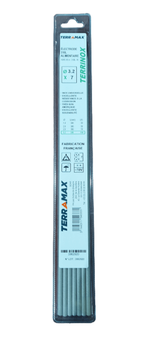316L. A enrobage rutilo-basique à très basse teneur en carbone. Ø 3,2 x 350 x 25.