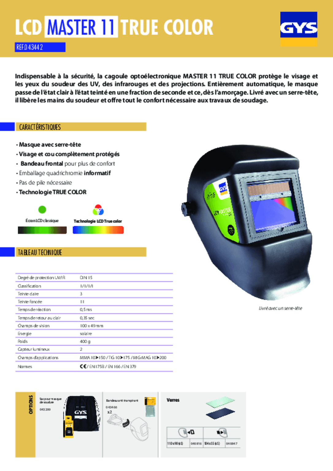 Le masque de soudure protège le visage et les yeux des UV, des infra-rouges et des projections. Le masque passe de l'état clair à l'état teinté automatiquement. Livré avec un serre-tête. Teinté 3 à 11. Champs de vision : 100 x 49 mm. DIN 15. Alimentation : cellule solaire.
